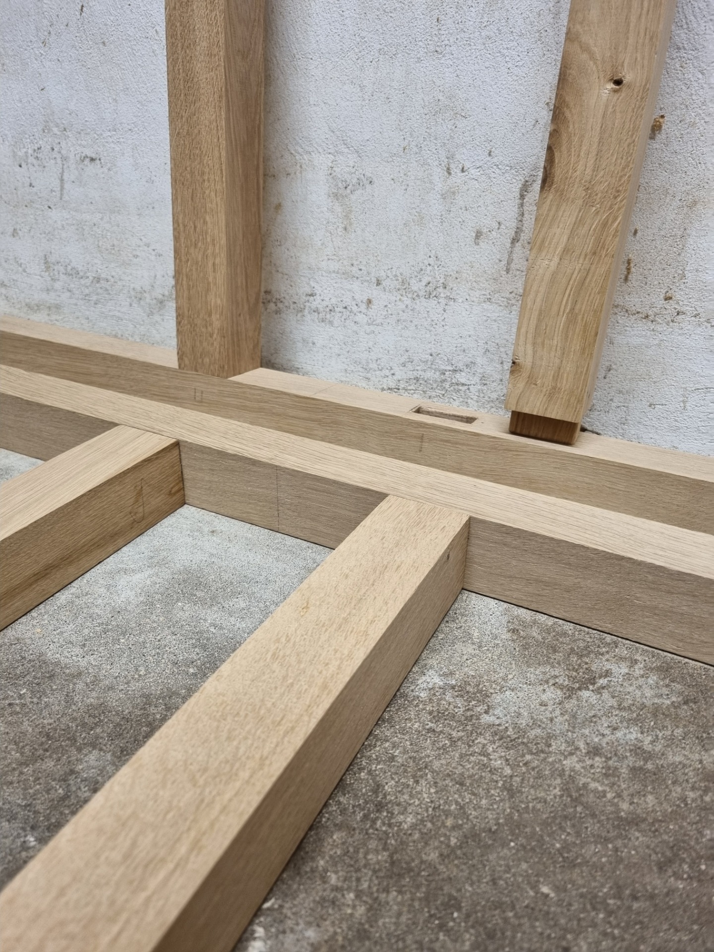 Bordets ben er håndlavet i massiv eg og samlet med omhu. Den tapsamlede konstruktion skaber et meget solidt møbel, der understøtter bordets enkle form. Samlingerne er udført med respekt for snedkertraditionen, så helheden fremstår ærlig, let og naturligt forankret i håndværket.